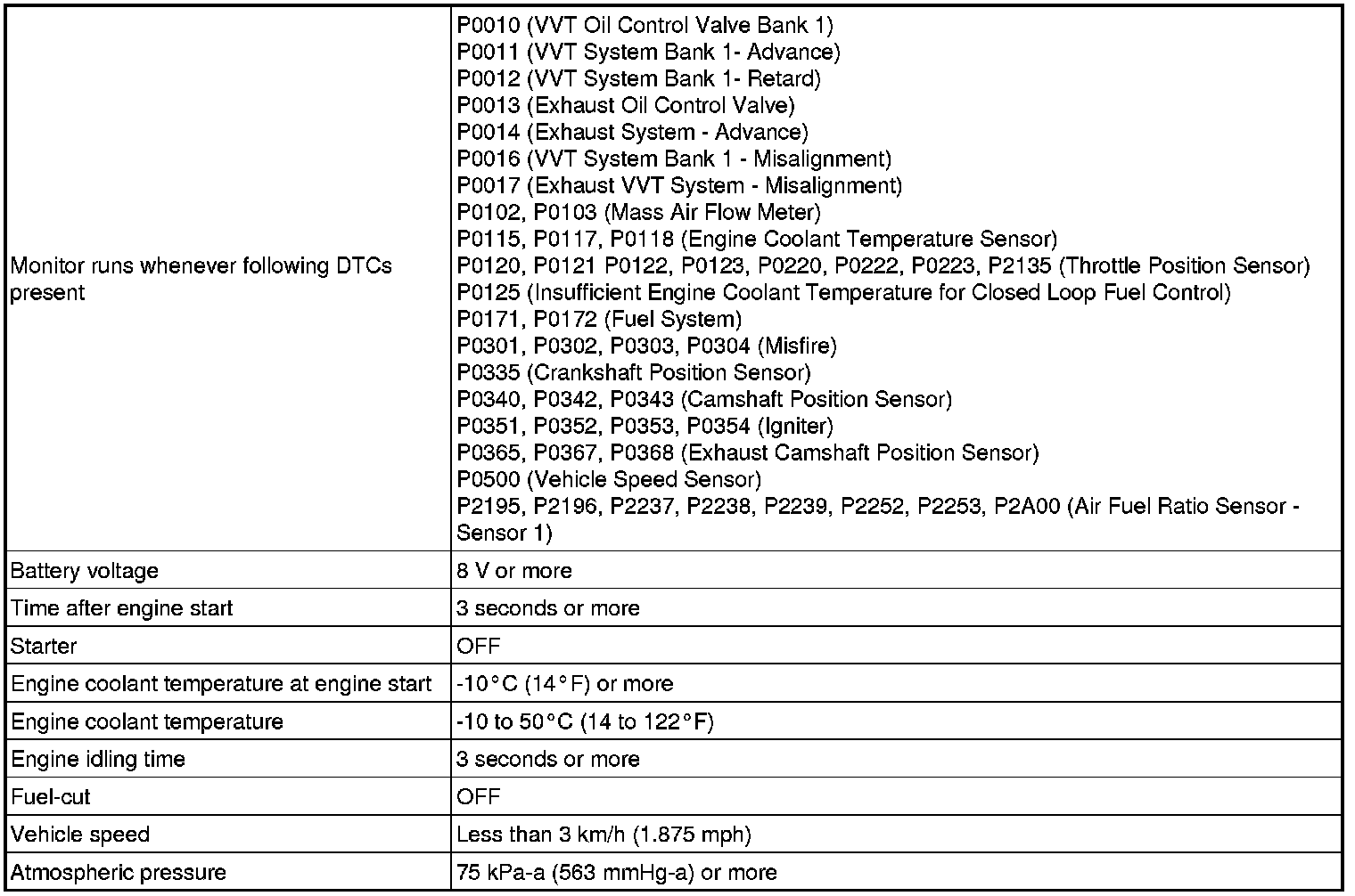 This monitor will run when the engine is started at an engine coolant temperature of -10 to 50°C (14 to 122°F). The DTC can be set after the engine idles for 13 seconds (2 trip detection logic).