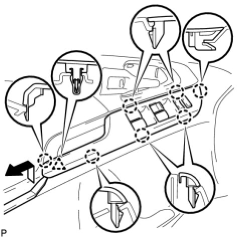 (a) Using a moulding remover, disengage the clip and 7 claws and remove the front armrest upper base panel.