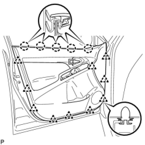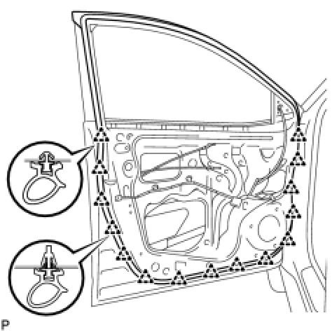 (a) Using a clip remover, disengage the 15 clips and remove the front door weatherstrip.