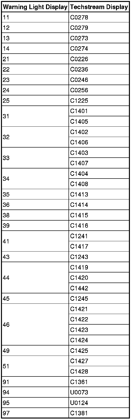 DTC Chart For ABS: