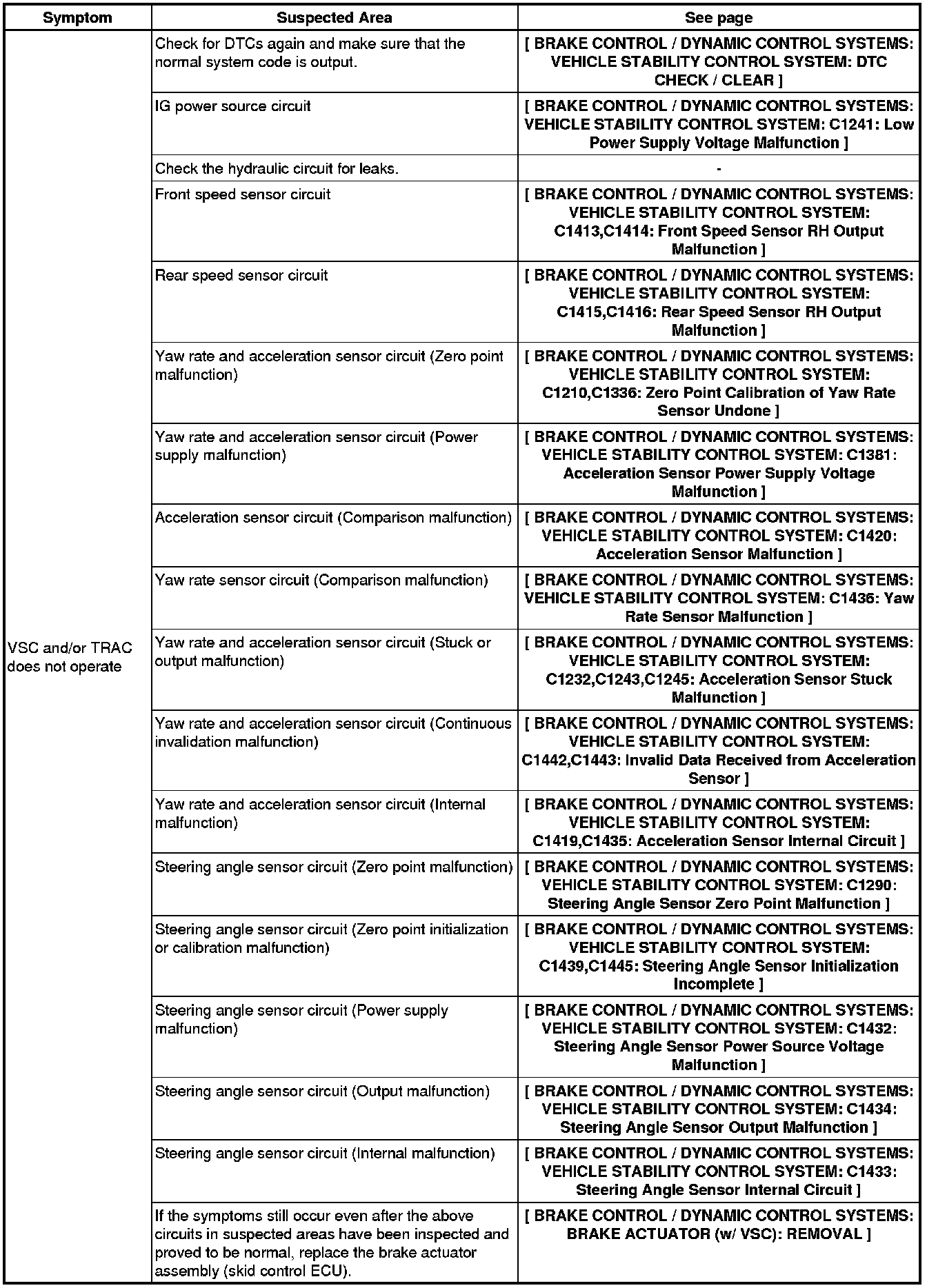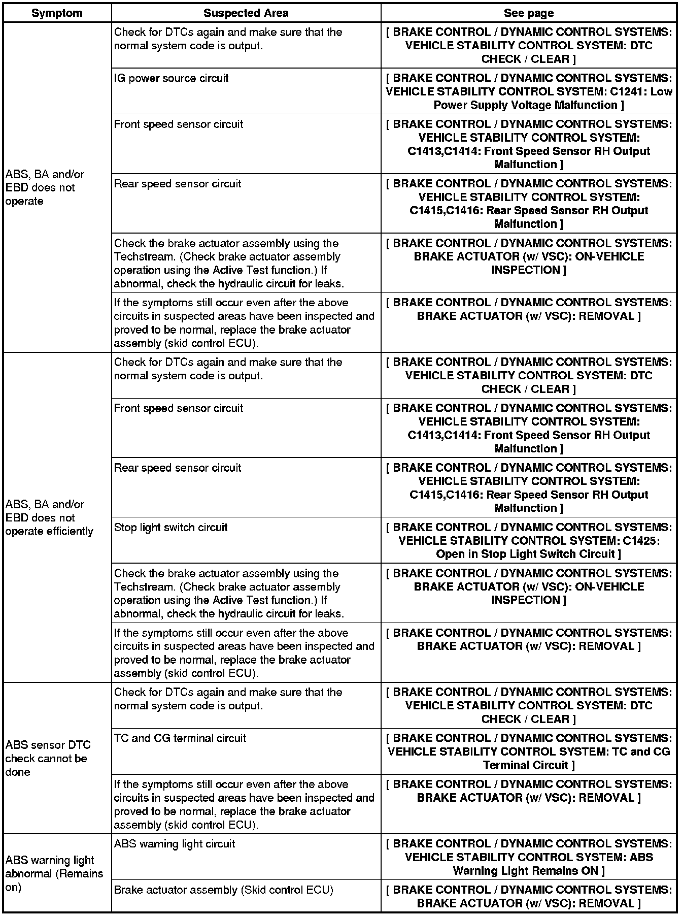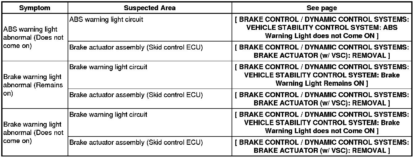 BRAKE CONTROL / DYNAMIC CONTROL SYSTEMS: VEHICLE STABILITY CONTROL SYSTEM (for 2ZR-FE): PROBLEM SYMPTOMS TABLE