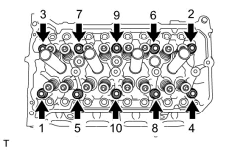 (a) Using several steps, uniformly loosen and remove the 10 cylinder head bolts and 10 plate washers with a 10 mm bi-hexagon wrench in the sequence shown in the illustration.