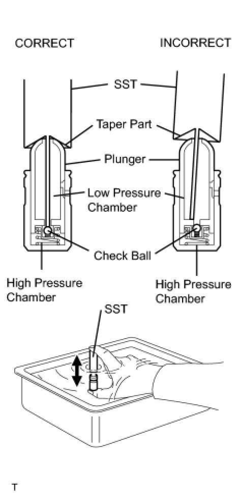 When bleeding the high-pressure chamber, make sure that the tip of SST is actually pressing the check ball as shown in the illustration. If the check ball is not pressed, the high-pressure chamber will not be bled.