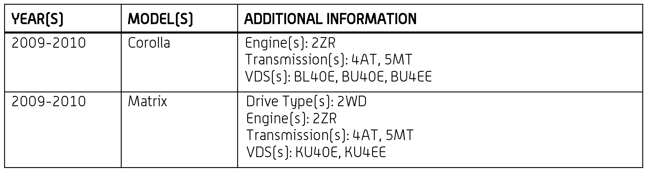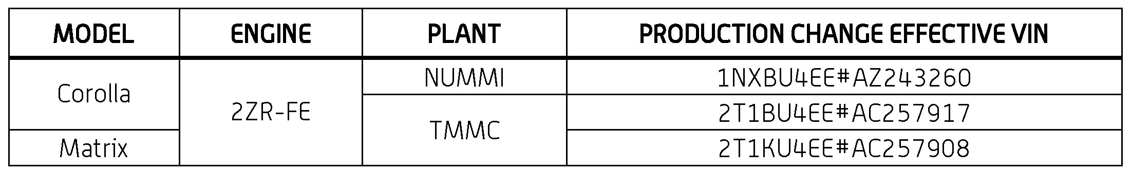 This TSB applies to ALL 2009 - 2010 Japan-built Corolla vehicles and to North American vehicles produced BEFORE the Production Change Effective VINs shown.