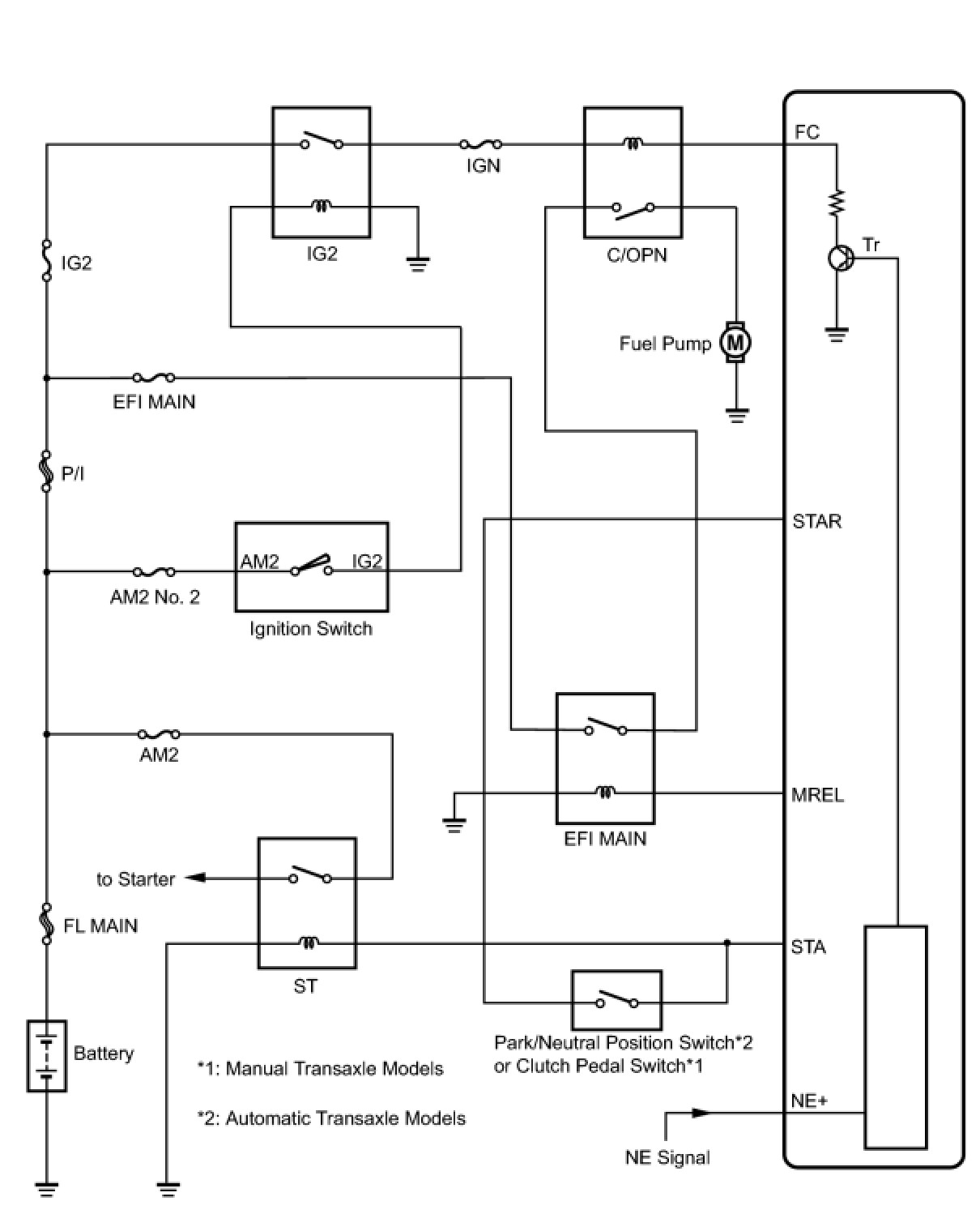 While the NE signal is generated (engine running), the ECM keeps Tr on (circuit opening relay on) and the fuel pump also keeps operating.