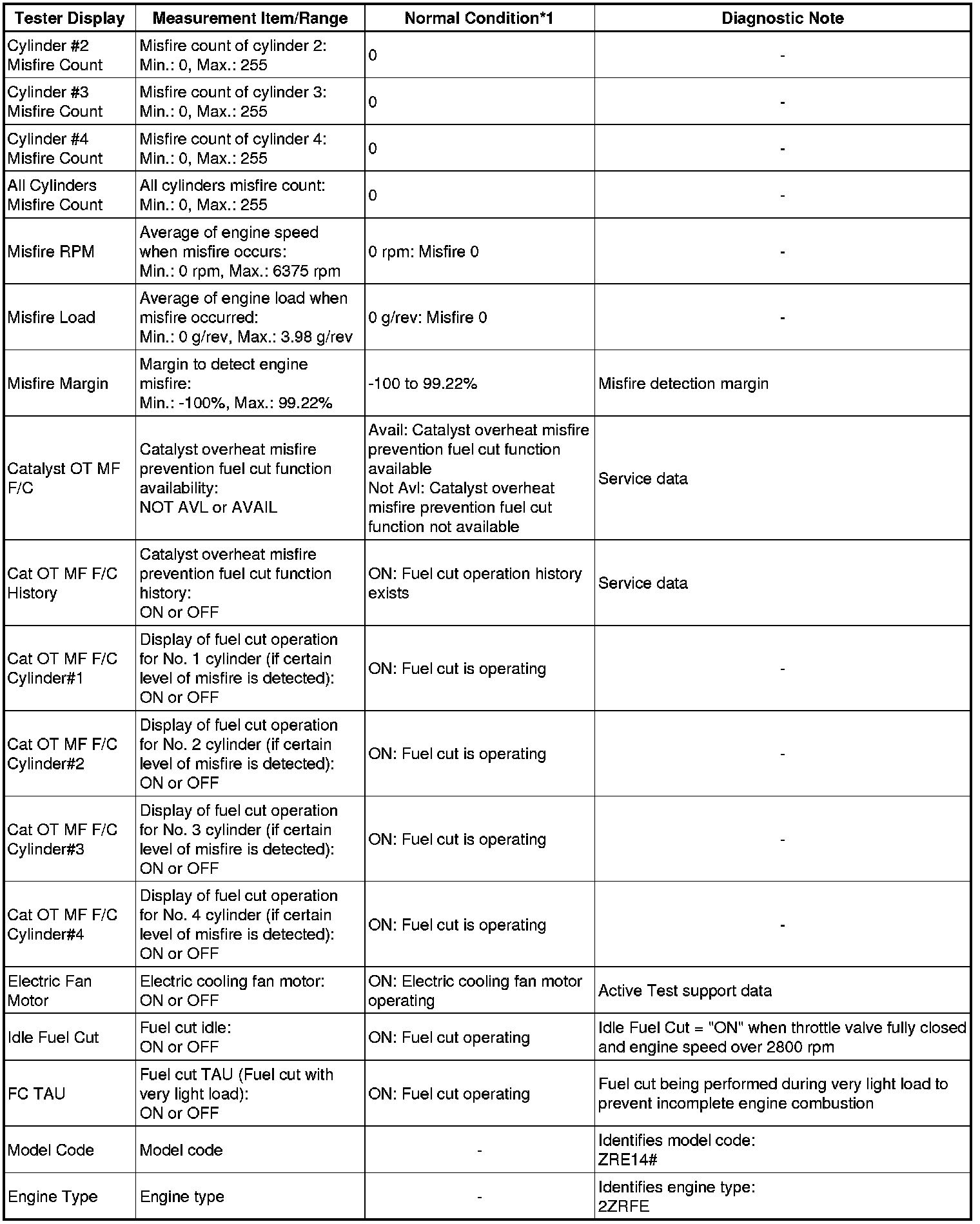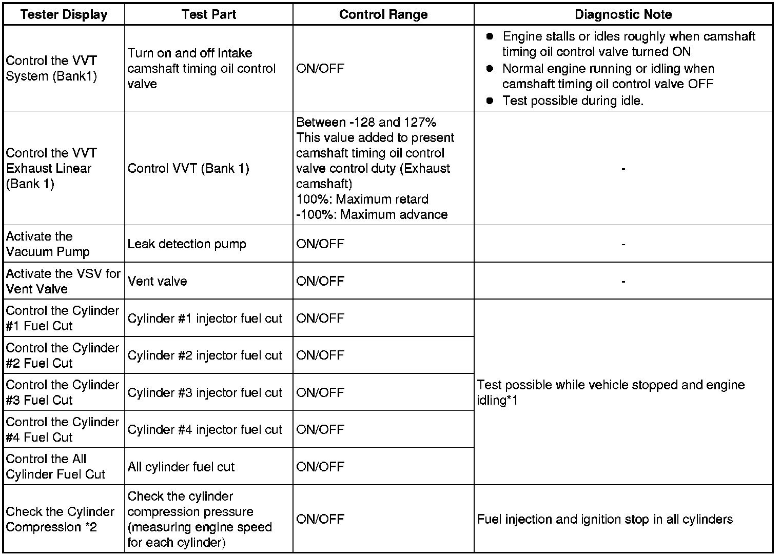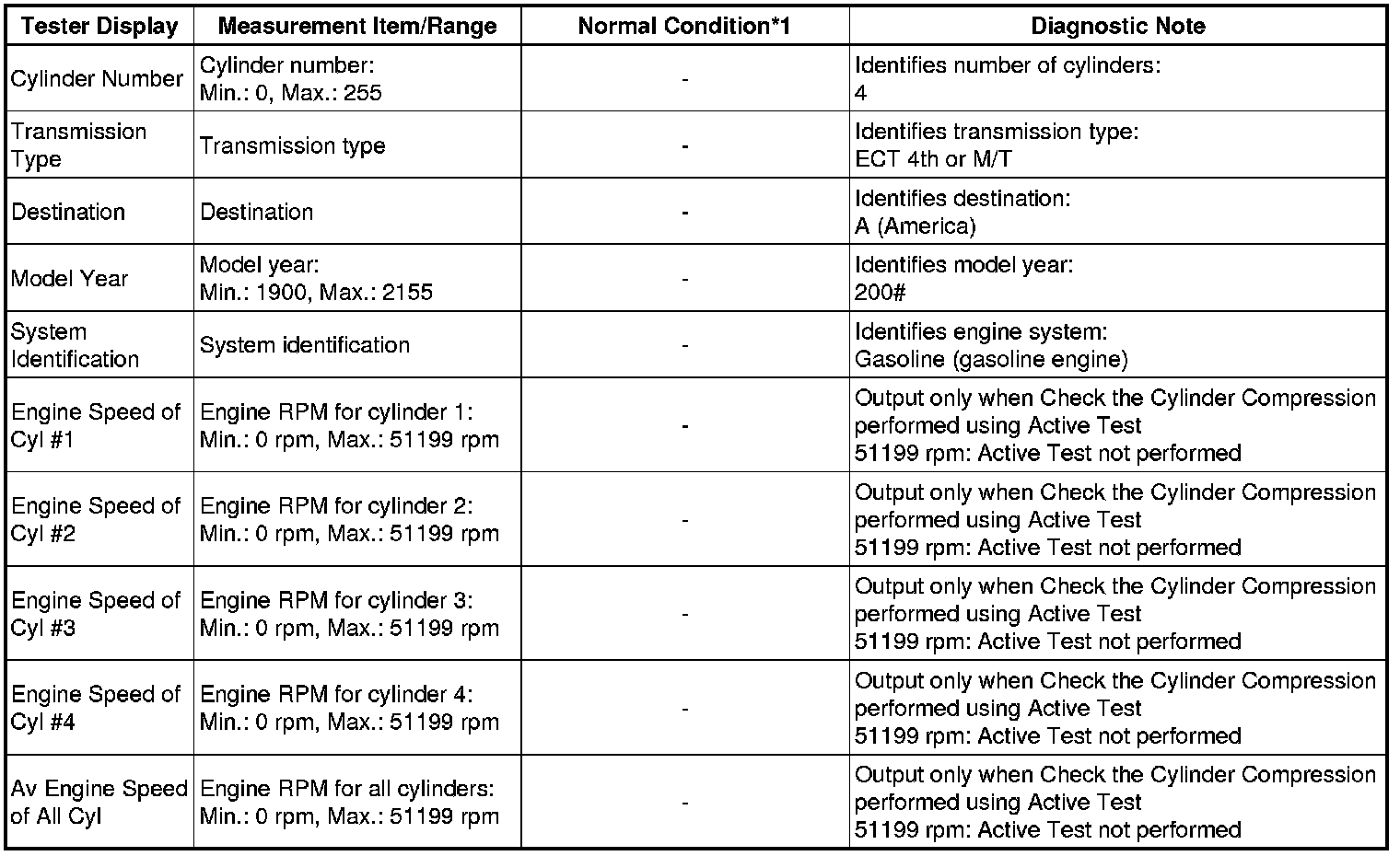 *2: While the Active Test item Check the Cylinder Compression is being performed, the fuel and ignition of all cylinders is cut. At this time, the ECM measures the speed of each cylinder while the engine is being cranked.