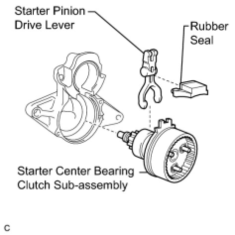 (b) Remove the starter center bearing clutch sub-assembly, rubber seal, and starter pinion drive lever.