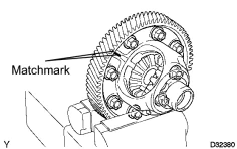 (c) After moisture on the ring gear has completely evaporated, align the matchmarks and quickly install the front differential ring gear onto the front differential case.