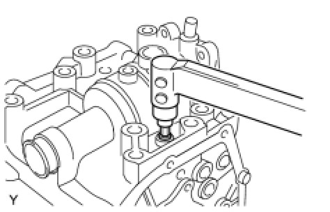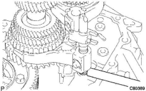 (d) Using a hexagon wrench and a torque wrench, install the reverse restrict pin plug onto the manual transmission case.