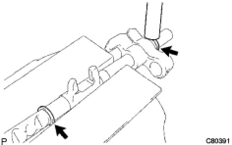 (c) Using a brass bar and a hammer, install 2 new shift fork shaft snap rings onto the No. 3 shift fork shaft.