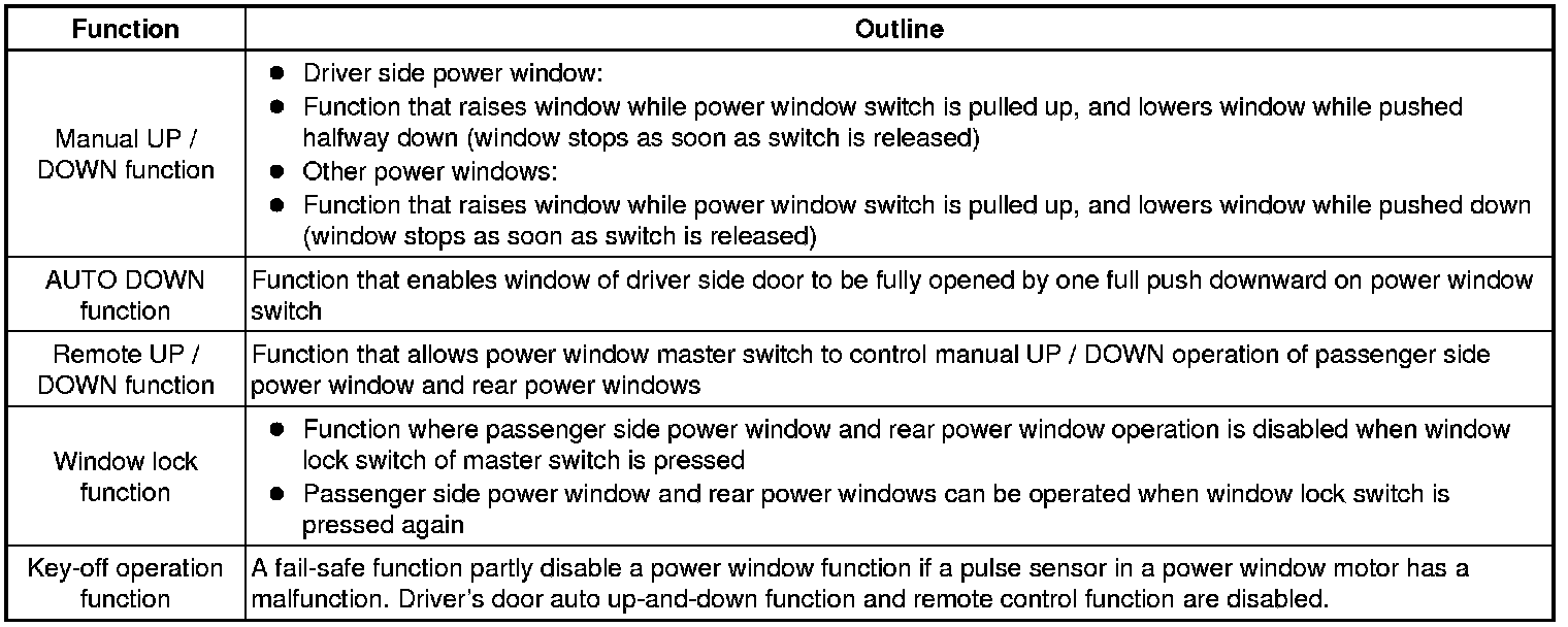 The main controls of this system are: the power window master switch, which is built into the driver side door, and the power window switches, which are built into the passenger side door and rear doors. Pressing the switch or any of the switches on the master switch transmits an UP / DOWN signal to the corresponding power window regulator motor.