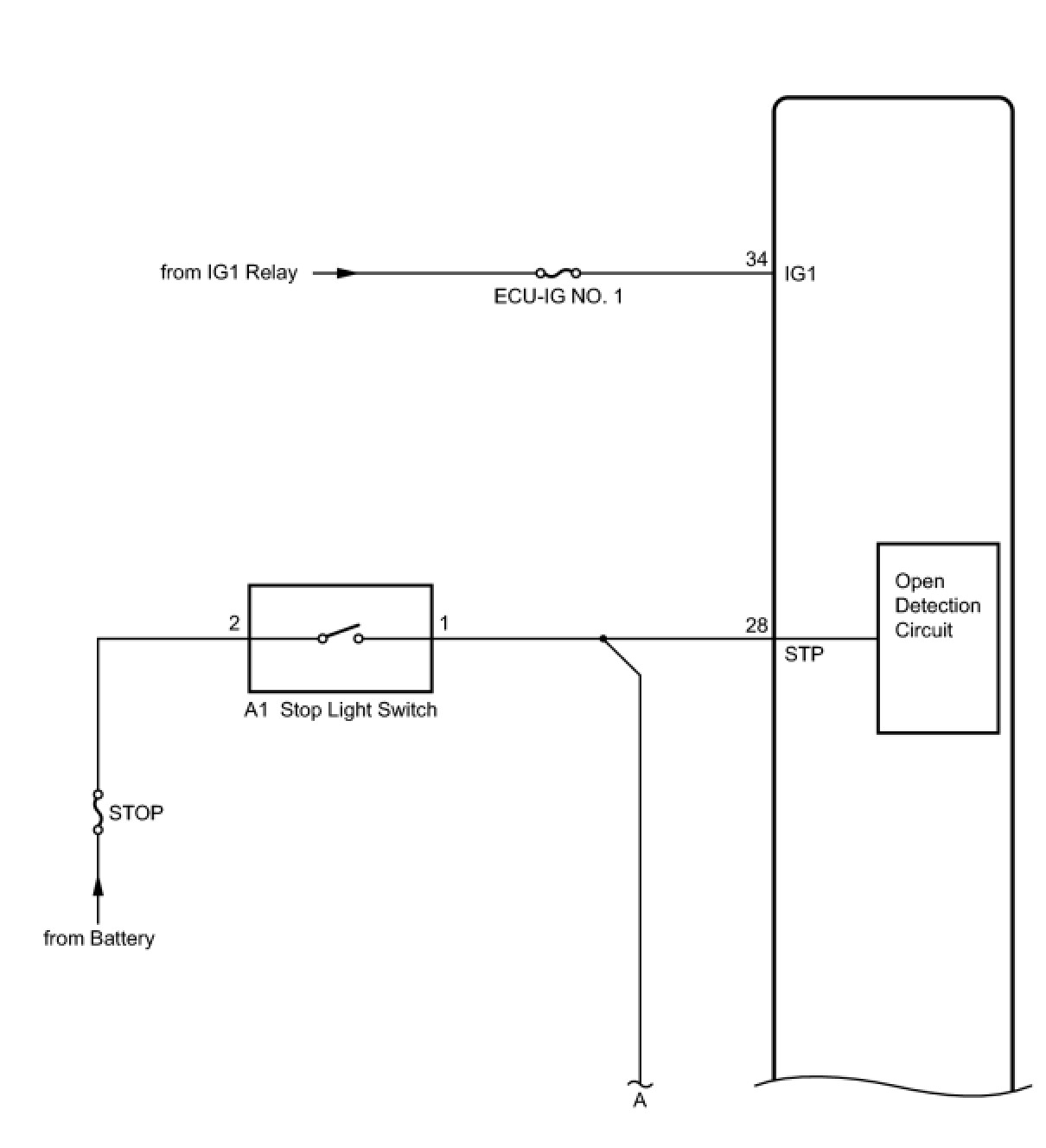 The skid control ECU has an open detection circuit, which outputs this DTC when detecting an open in the stop light input line or the ground line of the stop light circuit with the stop light switch off (brake pedal not depressed).