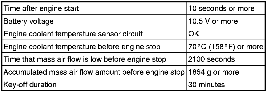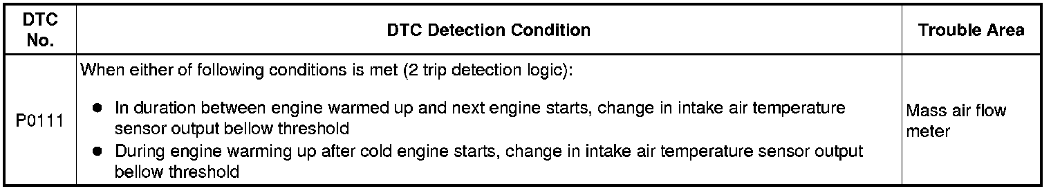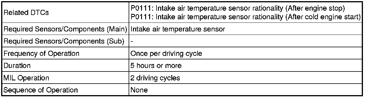 The monitor runs when the engine is started cold after 5 hours or more have elapsed since the engine stopped. If the intake air temperature sensor output variation until the engine has warmed up completely is less than the threshold, it is determined that a malfunction has occurred in the intake air temperature sensor. When this is detected in 2 consecutive driving cycles, the MIL is illuminated and the DTC is set.