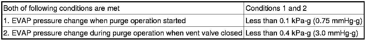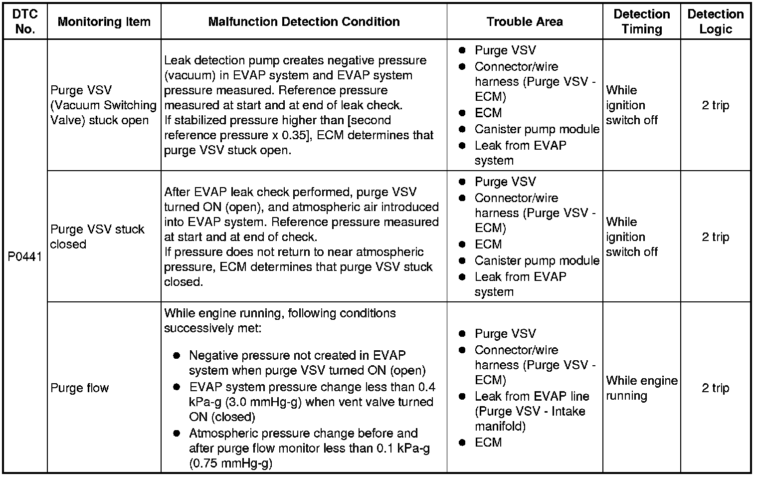 The vent valve is turned ON (closed) and the EVAP pressure is then measured. If the variation in the pressure is less than 0.4 kPa-g (3.0 mmHg-g), the ECM interprets this as the purge VSV being stuck closed, and illuminates the MIL and sets DTC P0441 (2 trip detection logic).