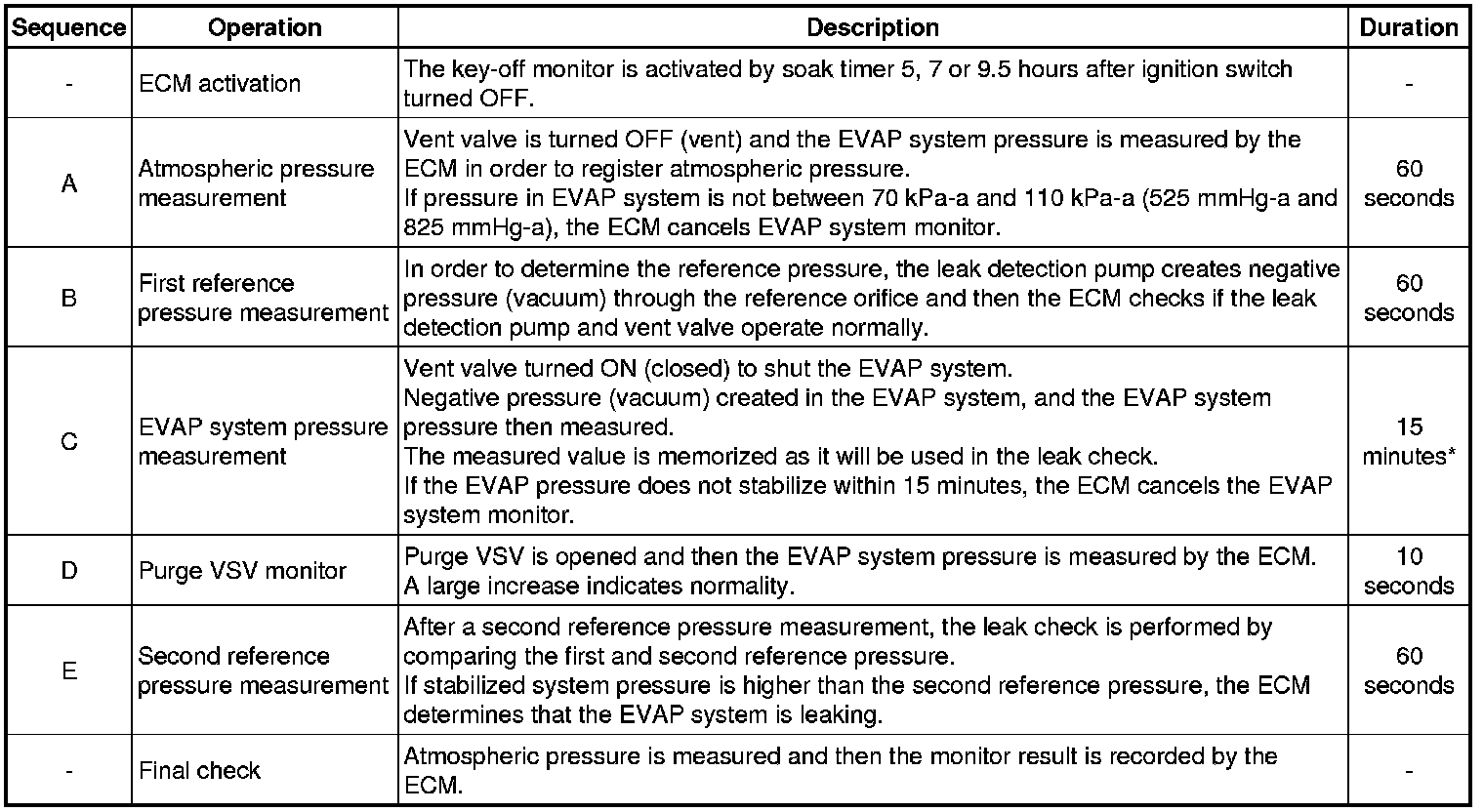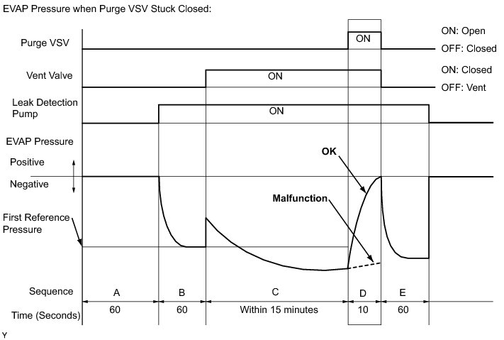 In operation D, the canister pressure sensor measures the EVAP system pressure. The pressure measurement for the purge VSV monitor is begun when the purge VSV is turned ON (open) after the EVAP leak check. When the measured pressure indicates an increase of 0.3 kPa-g (2.25 mmHg-g) or more, the purge VSV is functioning normally. If the pressure does not increase, the ECM interprets this as the purge VSV being stuck closed. The ECM illuminates the MIL and sets the DTC (2 trip detection logic).
