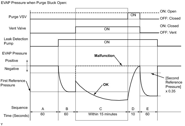 In operation C, the leak detection pump creates negative pressure (vacuum) in the EVAP system. The EVAP system pressure is then measured by the ECM using the canister pressure sensor. If the stabilized system pressure is higher than [second reference pressure x 0.35], the ECM interprets this as the purge VSV (Vacuum Switching Valve) being stuck open. The ECM illuminates the MIL and sets the DTC (2 trip detection logic).