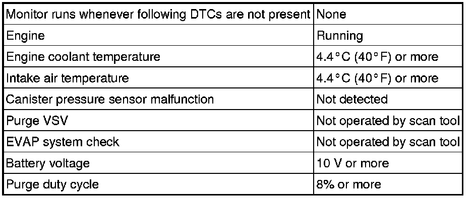 While the engine is running and the purge VSV is ON (open), the ECM monitors the purge flow by measuring the EVAP pressure change. If negative pressure is not created, the ECM begins the 2nd monitor.