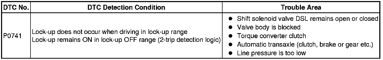 If the ECM detects no lock-up after lock-up has been requested or if it detects lock-up when it is not requested, the ECM interprets this as a fault in the shift solenoid valve DSL or lock-up system performance. The ECM will turn on the MIL and store the DTC.