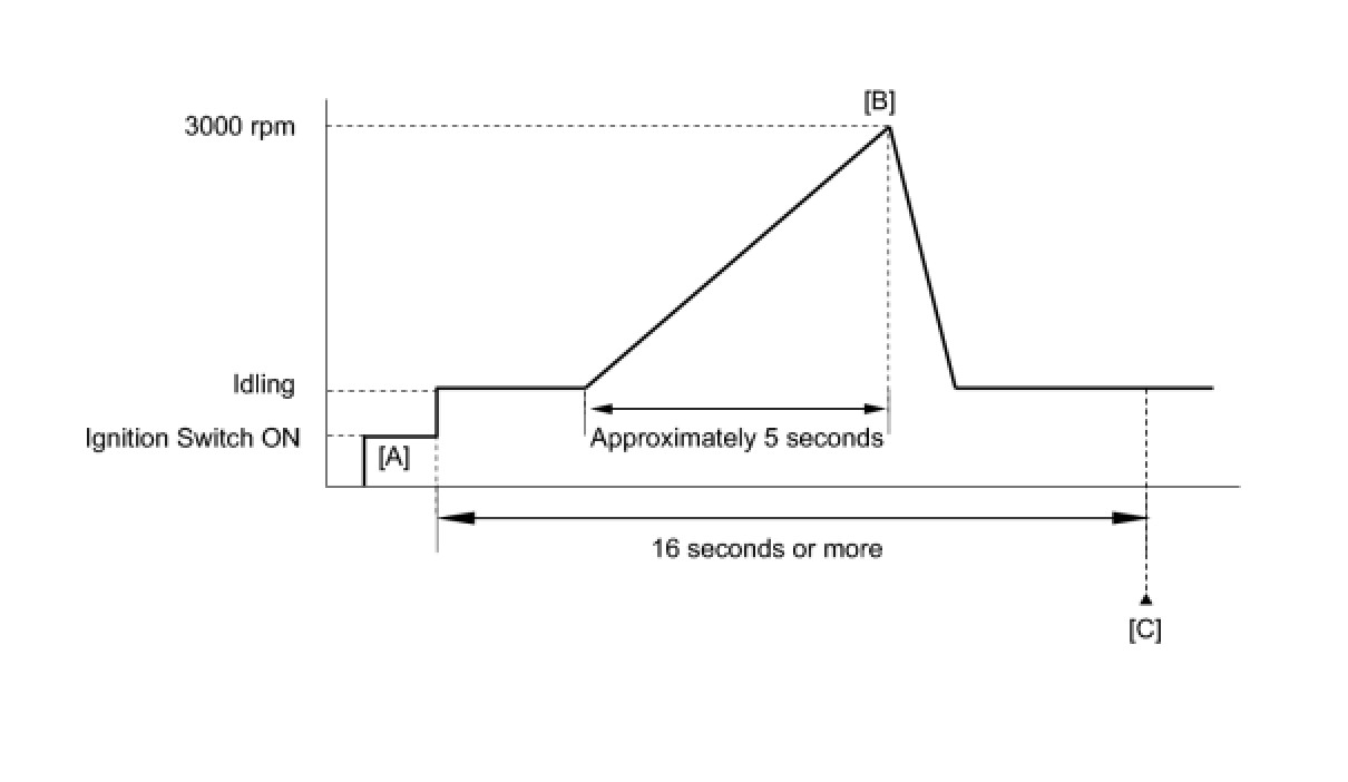 7. Slowly depress the accelerator pedal, raise the engine speed to approximately 3000 rpm for approximately 5 seconds, and then idle the engine [B].