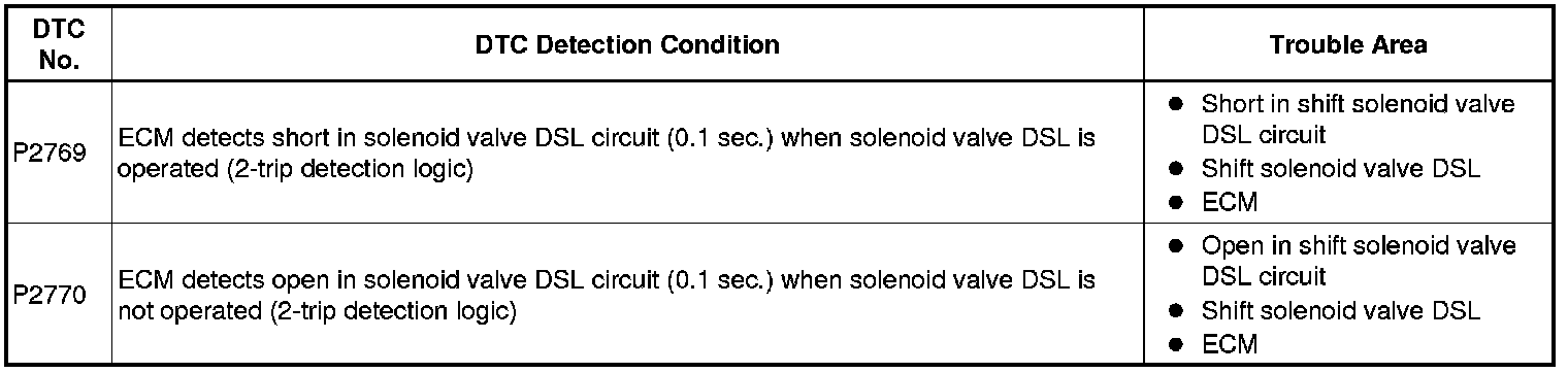 U250E AUTOMATIC TRANSMISSION / TRANSAXLE: AUTOMATIC TRANSAXLE SYSTEM: P2769,P2770: Torque Converter Clutch Solenoid Circuit Low (Shift Solenoid Valve DSL)