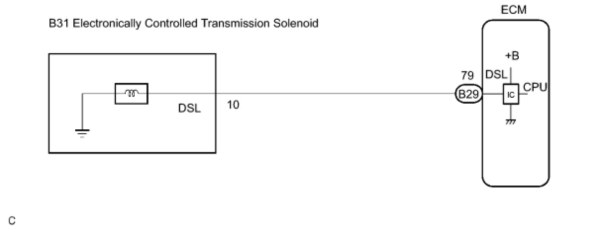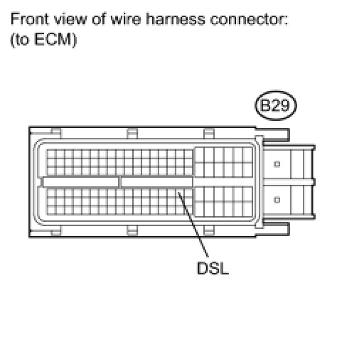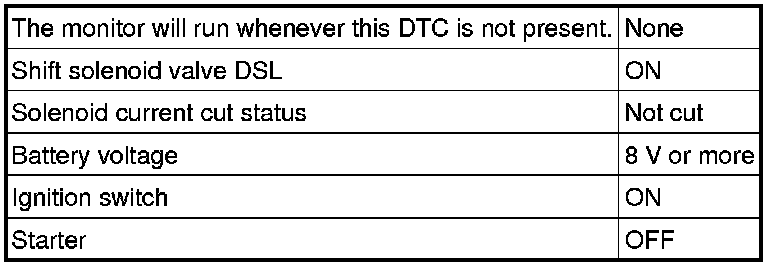 Torque converter lock-up is controlled by the ECM based on engine rpm, engine load, engine temperature, vehicle speed, transmission temperature, and shift range selection. The ECM determines the lock-up status of the torque converter by comparing the engine rpm (NE) to the input turbine rpm (NT). The ECM calculates the actual transmission gear by comparing input turbine rpm (NT) to counter gear rpm (NC). When conditions are appropriate, the ECM requests "lock-up" by applying control voltage to the shift solenoid DSL. When the DSL is opened, it applies pressure to the lock-up relay valve and locks the torque converter clutch. If the ECM detects an open or short in the DSL solenoid circuit, the ECM interprets this as a fault in the DSL solenoid or circuit. The ECM will turn on the MIL and store the DTC.