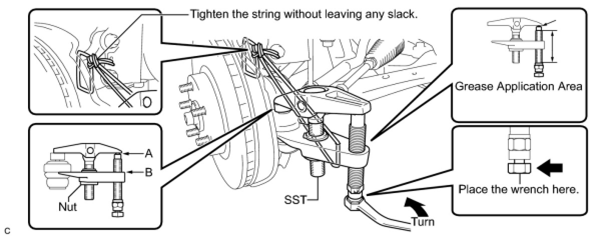 * Be sure to tighten the string firmly to secure SST to the steering knuckle to prevent SST from falling off.