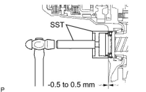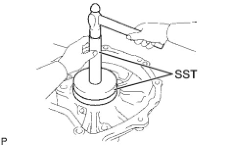 (b) Using SST and a hammer, install the front differential case rear tapered roller bearing outer race to the transaxle case.