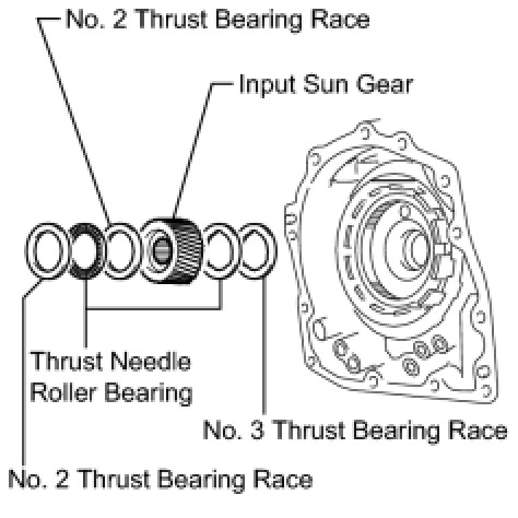(a) Remove the 2 thrust needle roller bearings, No. 2 thrust bearing races, No. 3 thrust bearing race, and input sun gear from the transaxle case.