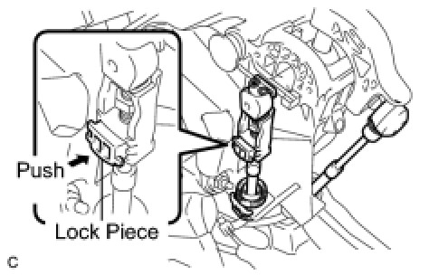 (c) Push the 2 claws together at the top of the transmission control cable lock piece. While holding the 2 claws together, push the 2 lugs on the bottom of the lock piece toward each other and upward to pull out the lock piece.
