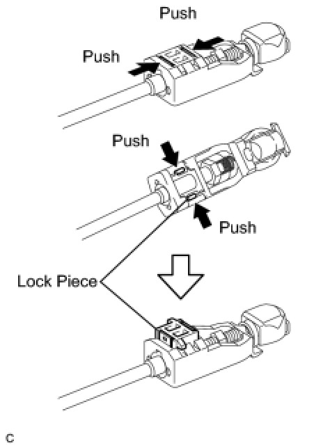 (g) Push the 2 claws together at the top of the transmission control cable lock piece. While holding the 2 claws together, push the 2 lugs on the bottom of the lock piece toward each other and upward to pull out the lock piece.