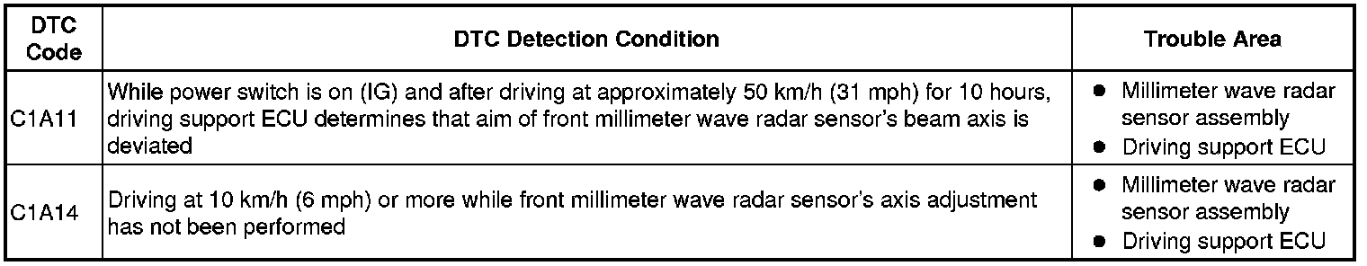 After installing a new millimeter wave radar sensor assembly, if the sensor beam axis adjustment is not performed, DTC C1A14 is stored.