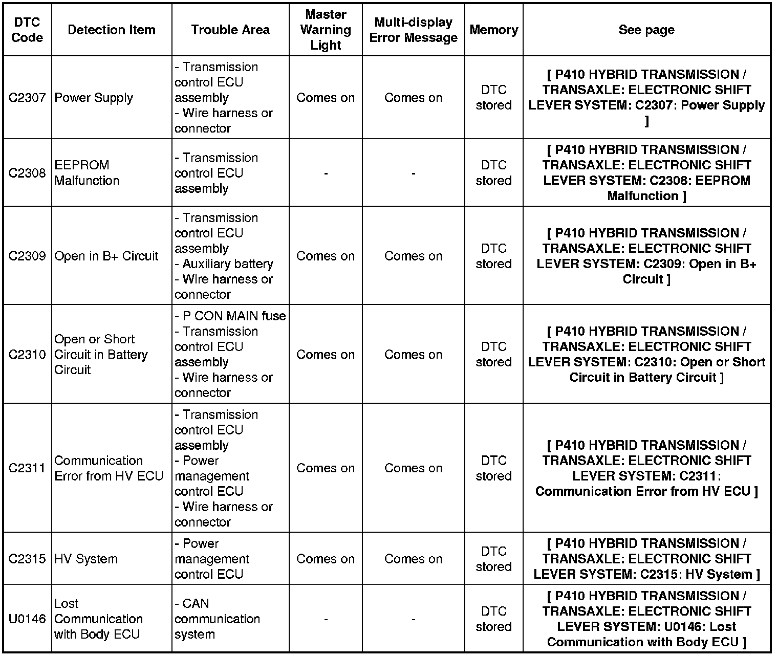 P410 HYBRID TRANSMISSION / TRANSAXLE: ELECTRONIC SHIFT LEVER SYSTEM: DIAGNOSTIC TROUBLE CODE CHART