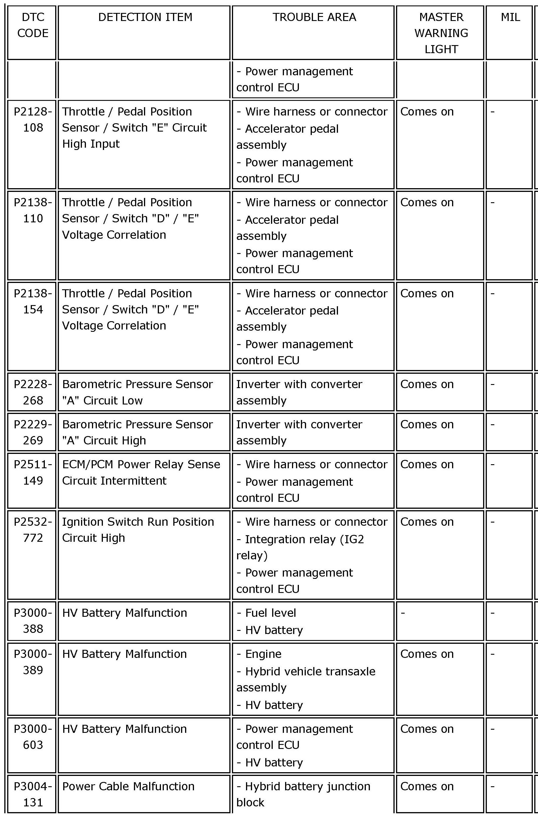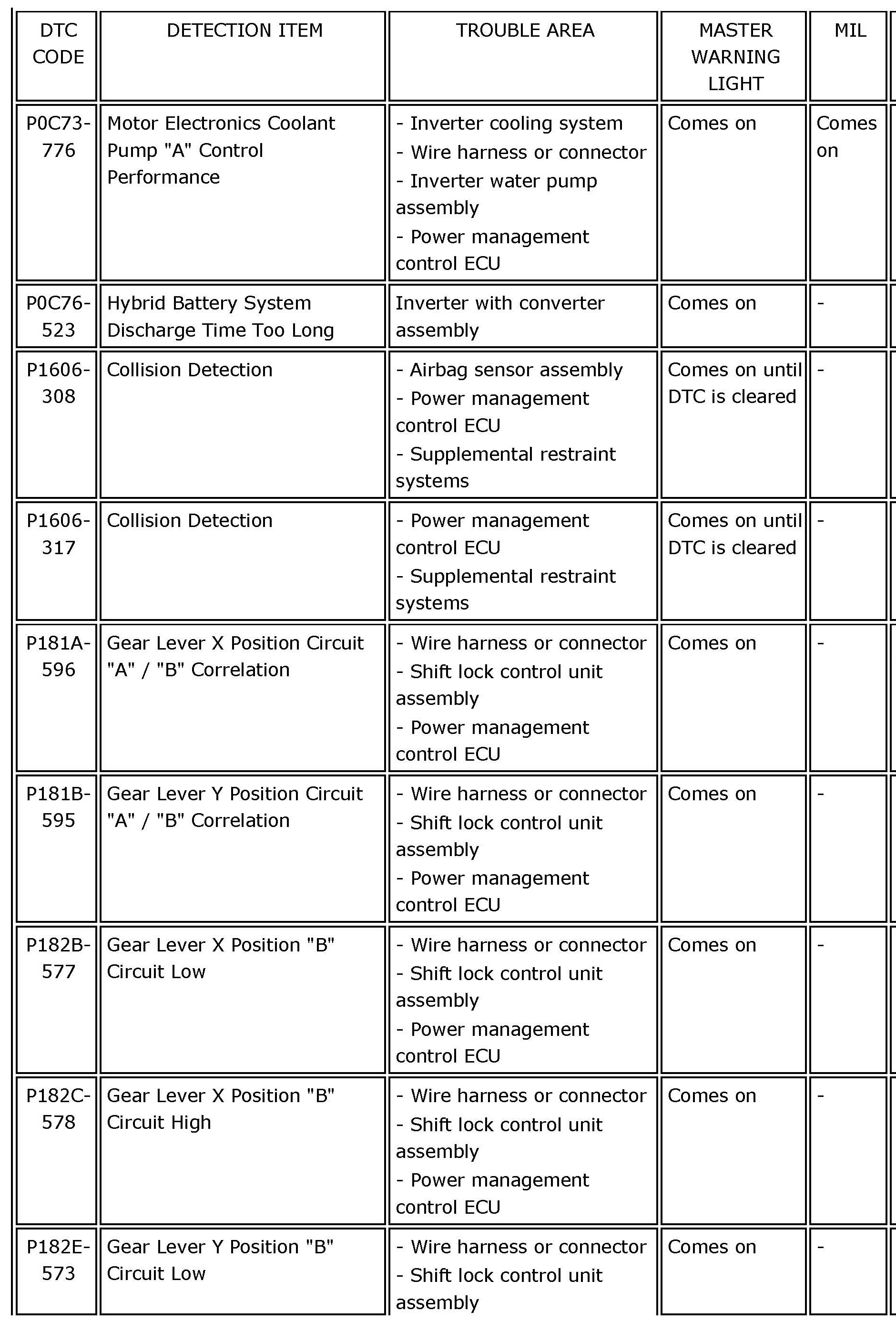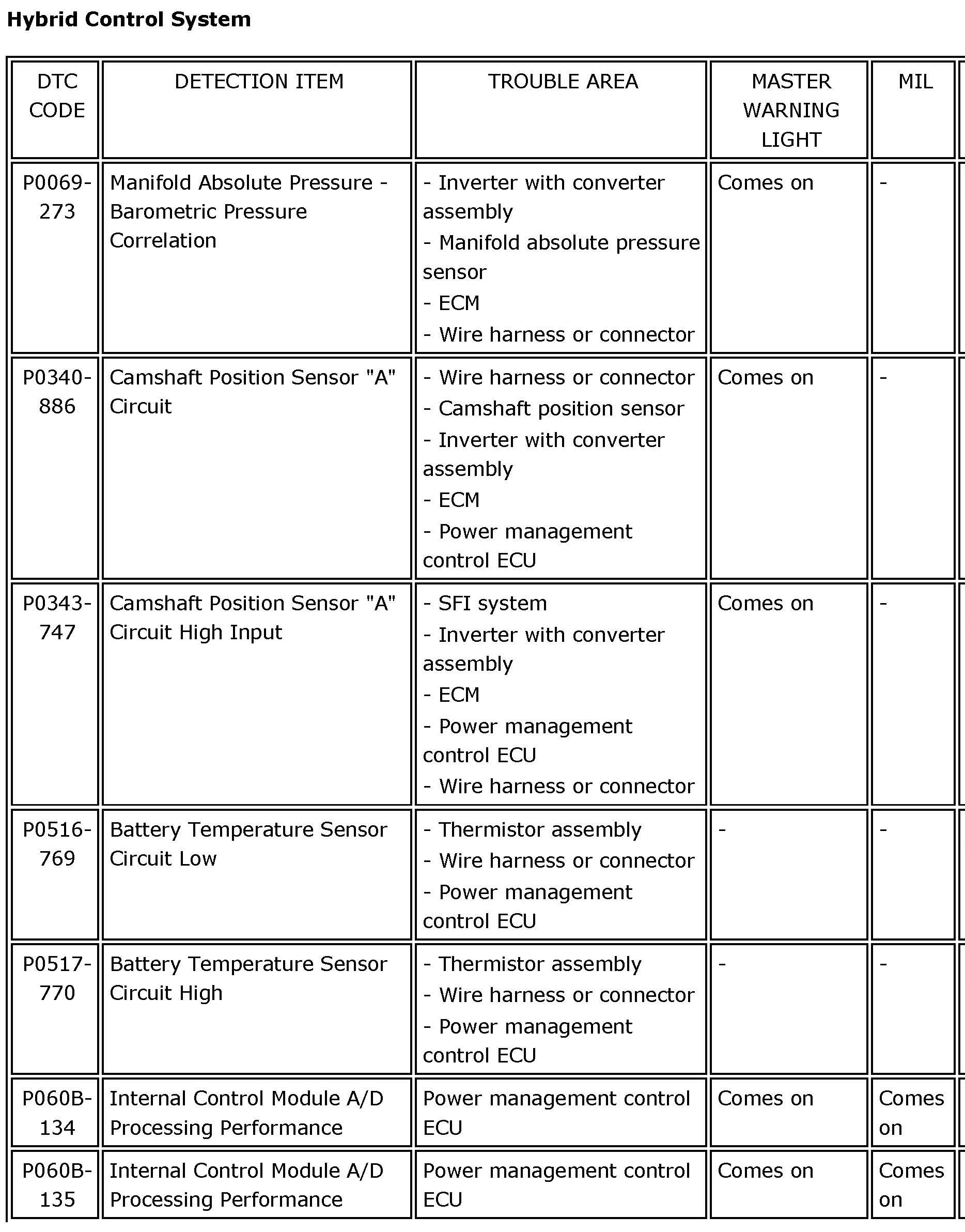 HYBRID VEHICLE CONTROL: HYBRID CONTROL SYSTEM:DIAGNOSTIC TROUBLE CODE CHARTP0069-273 - P060B-135: