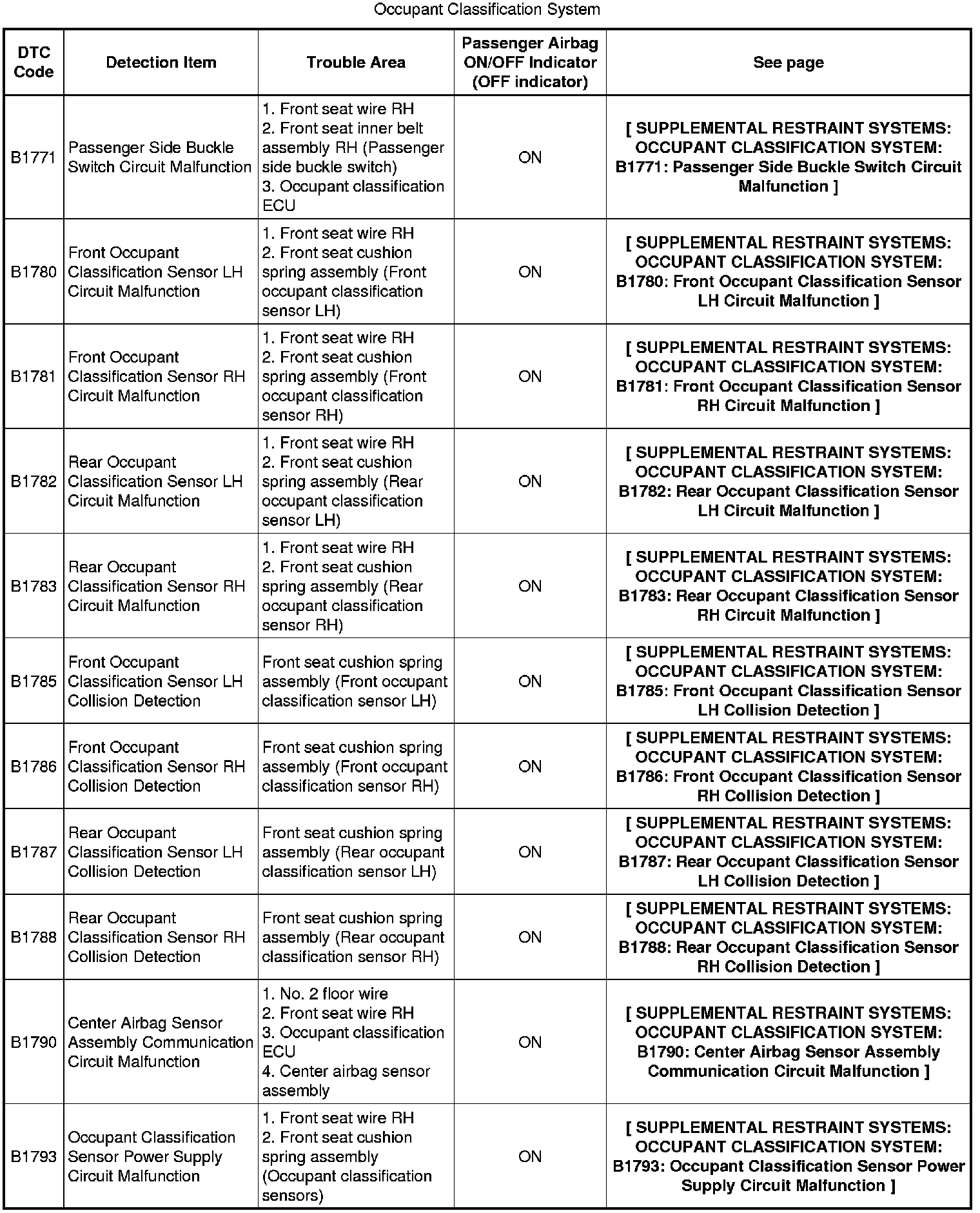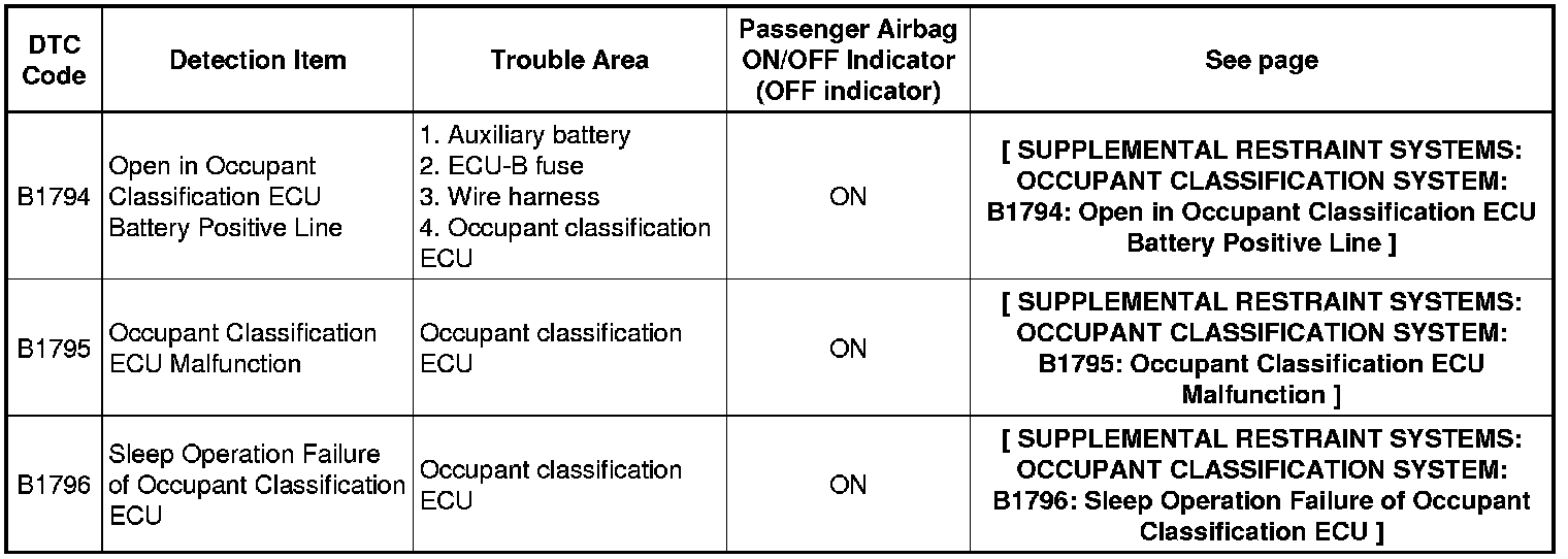 SUPPLEMENTAL RESTRAINT SYSTEMS: OCCUPANT CLASSIFICATION SYSTEM: DIAGNOSTIC TROUBLE CODE CHART