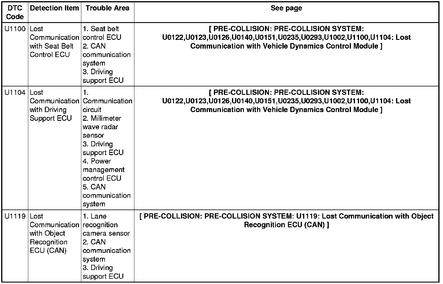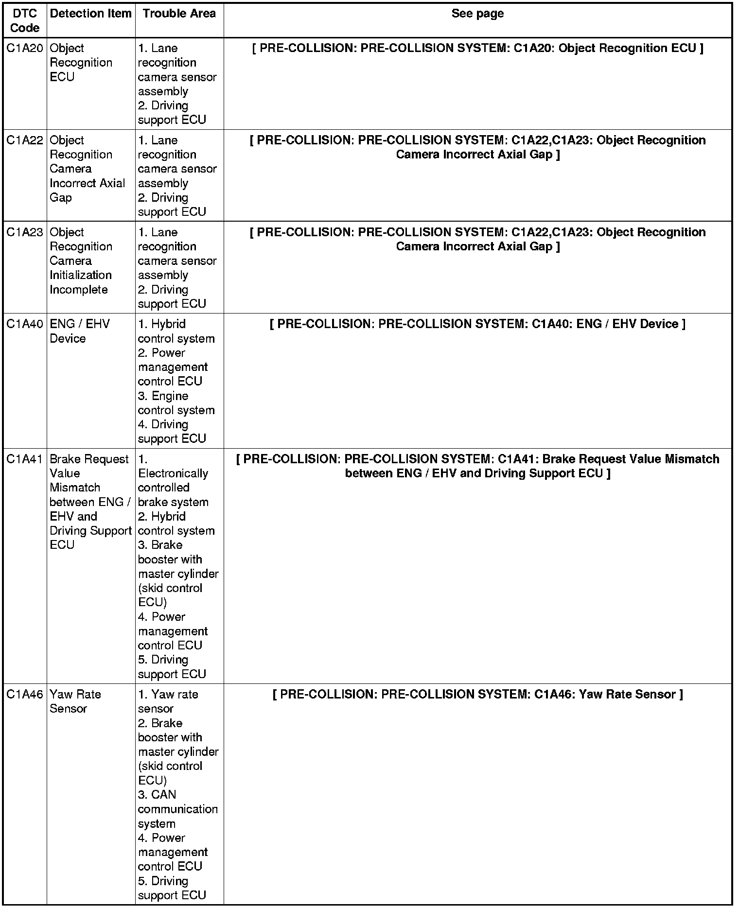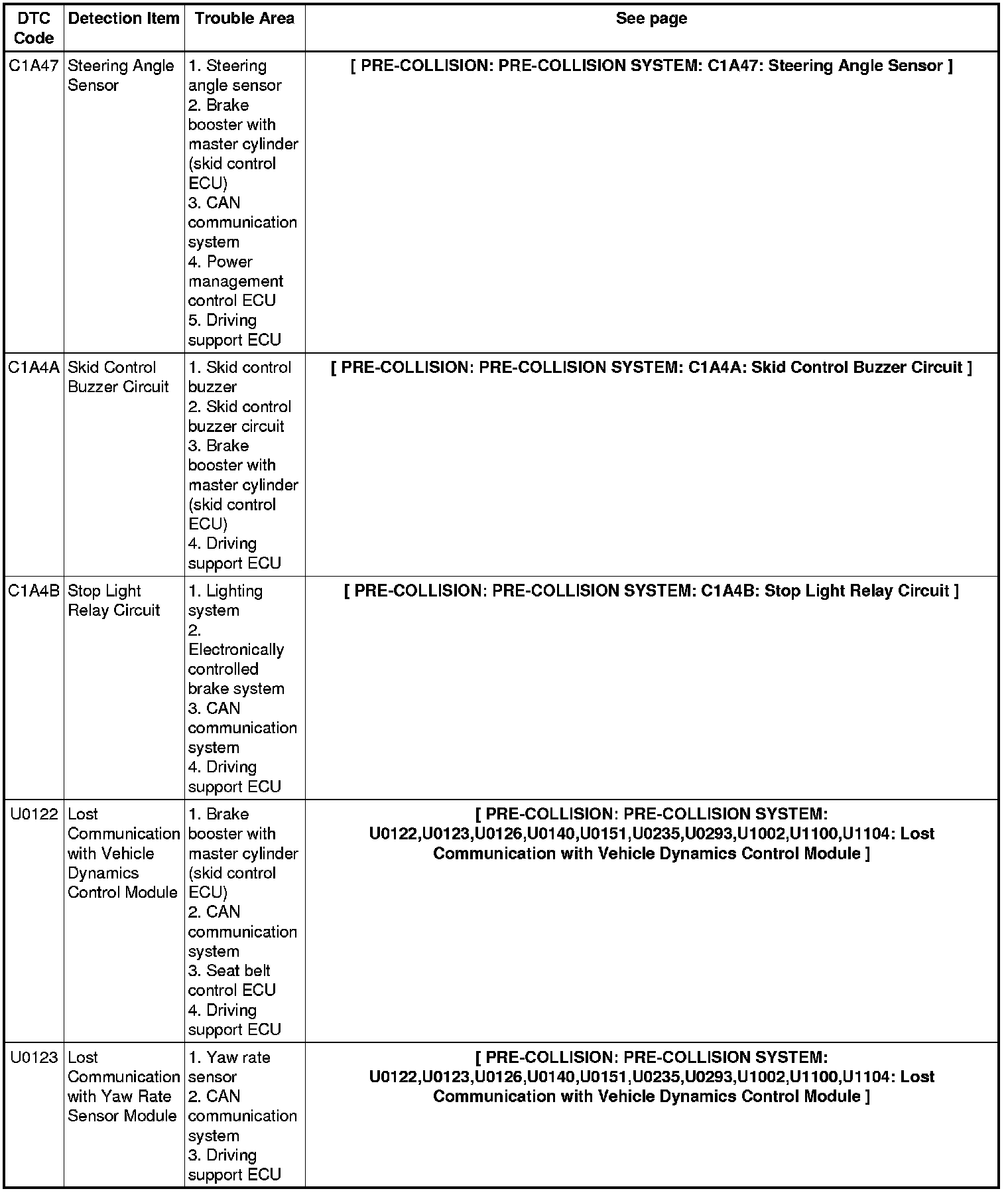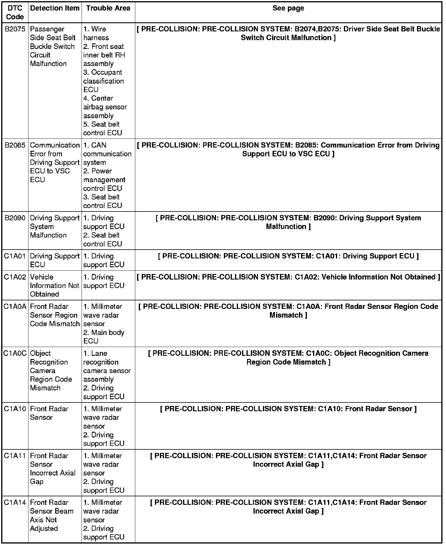 PRE-COLLISION: PRE-COLLISION SYSTEM: DIAGNOSTIC TROUBLE CODE CHART