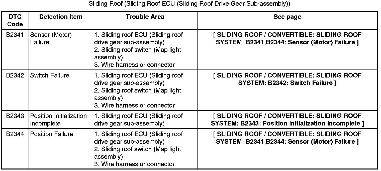 SLIDING ROOF / CONVERTIBLE: SLIDING ROOF SYSTEM: DIAGNOSTIC TROUBLE CODE CHART