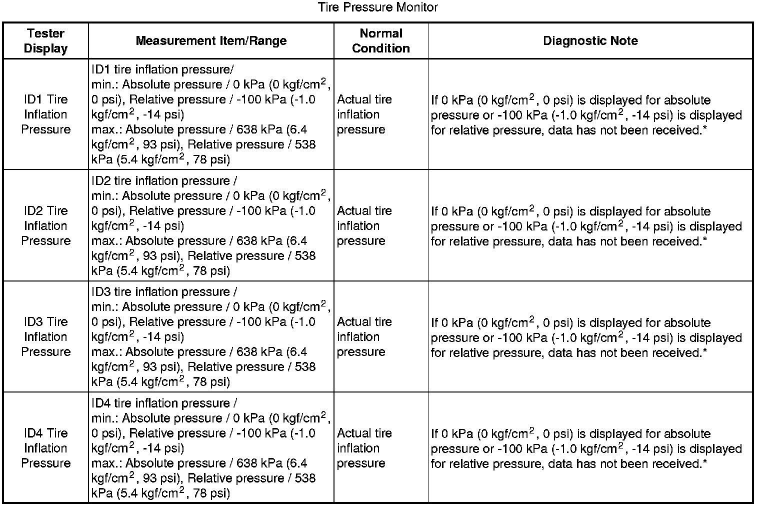 *: It may take about 2 or 3 minutes until the values are displayed. If the values are not displayed after a few minutes, perform troubleshooting according to the inspection procedure for DTCs C2121/21 to C2124/24 Transmitter ID4 Not Received (Test Mode DTC) - Tire Pressure Monitoring.