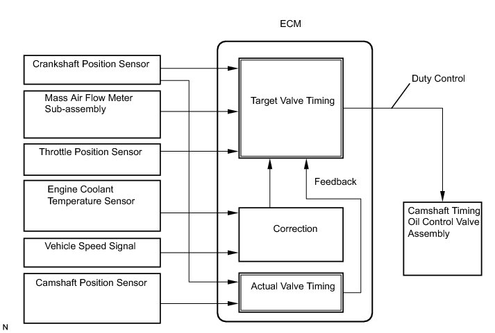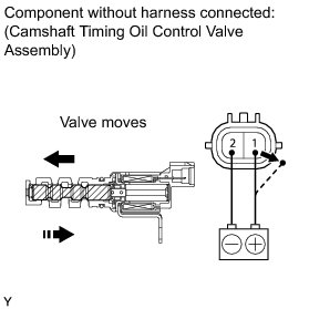 The camshaft timing oil control valve assembly is a solenoid valve and switches the engine oil line. The valve moves when the ECM applies the 12 V to the solenoid. The ECM changes the energizing time to the solenoid (duty-cycle) in accordance with the camshaft position, crankshaft position, throttle position, etc.