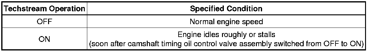 (l) Check the engine speed while operating the camshaft timing oil control valve assembly (for intake camshaft) using the Techstream with the engine coolant temperature is 50°C (122°F) or less.