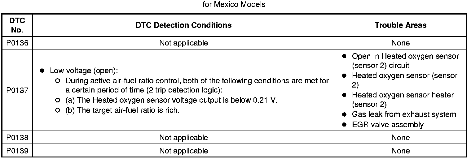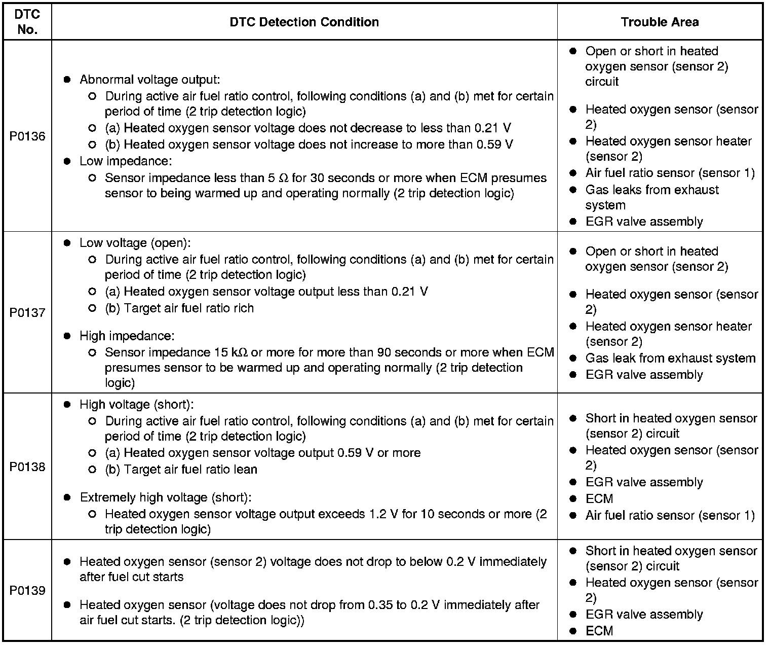 While the ECM is performing active air fuel ratio control, the air fuel ratio is forcibly regulated to become rich or lean. If the sensor is not functioning properly, the voltage output variation is small. For example, when the heated oxygen sensor voltage does not decrease to less than 0.21 V or does not increase to more than 0.59 V during active air fuel ratio control, the ECM determines that the sensor voltage output is abnormal and sets DTCs P0136.