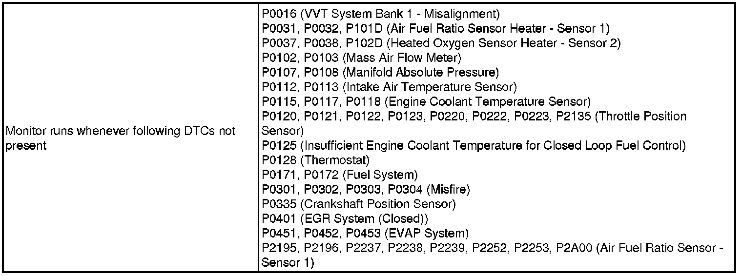 Active air fuel ratio control is performed for approximately 15 to 25 seconds while driving with a warm engine. During active air fuel ratio control, the air fuel ratio is forcibly regulated to become lean or rich by the ECM. If the ECM detects a malfunction, a DTC is set.
