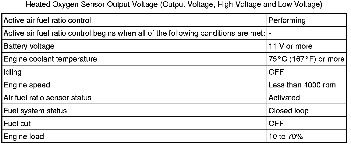 While performing active air fuel ratio control, when the target air fuel ratio is rich and the heated oxygen sensor voltage output is less than 0.21 V (lean), the ECM interprets this as an abnormally low sensor output voltage and sets DTC P0137. When the target air fuel ratio is lean and the voltage output is 0.59 V or more (rich) during active air fuel ratio control, the ECM determines that the sensor voltage output is abnormally high, and sets DTC P0138.