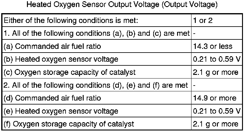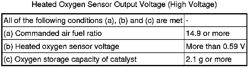 If the heated oxygen sensor has an open or short, or the voltage output of the sensor noticeably decreases, the oxygen storage capacity indicates an extraordinarily high value. Even if the ECM attempts to continue regulating the air fuel ratio to become rich or lean, the heated oxygen sensor output does not change.