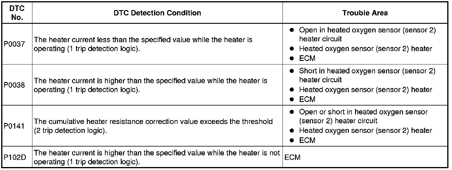 If the heater current is outside the normal range, the signal transmitted by the heated oxygen sensor becomes inaccurate. When the current in the heated oxygen sensor heater is outside the normal operating range, the ECM interprets this as a malfunction in the sensor heater and stores a DTC.