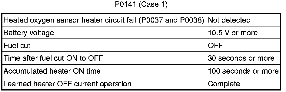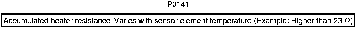 After the accumulated heater ON time exceeds 100 seconds, the ECM calculates the heater resistance using battery voltage and the current applied to the heater. If the resistance is above the threshold value, the ECM determines that there is a malfunction in the heated oxygen sensor heater and stores DTC P0141.
