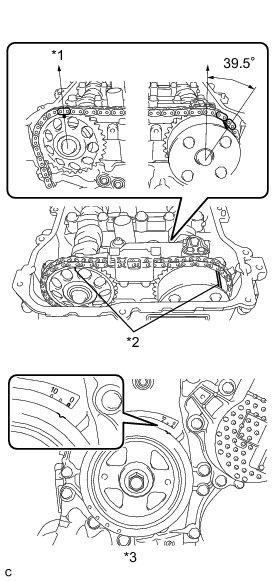 There are no marks on the cylinder head to match-up for the purpose of checking valve timing. Valve timing can only be inspected by lining up the colored plates on the timing chain with the marks on the pulleys. It may be necessary to remove and reinstall the chain to match-up the alignment marks Disassembly.