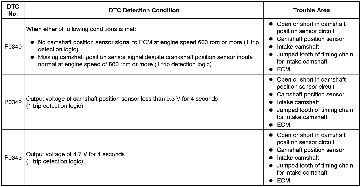 DTC P0340 indicates a malfunction relating to the camshaft position sensor circuit (the wire harness between the ECM and camshaft position sensor, and the camshaft position sensor itself).