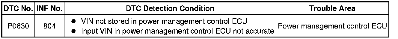 If P0630 is set, the VIN must be input to the power management control ECU using the Techstream. However, all DTCs are cleared automatically by the Techstream when inputting the VIN. If DTCs other than P0630-804 are set, check them first.