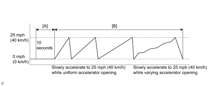 7. Slowly accelerate from a stop (0 mph (0 km/h)) to 25 mph (40 km/h) several times while using different acceleration patterns. [B]
