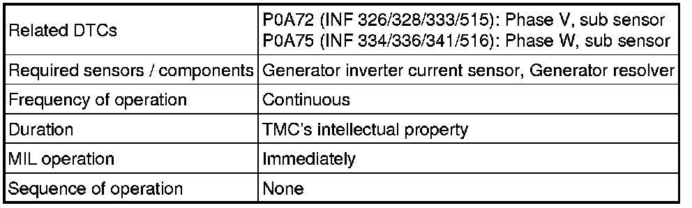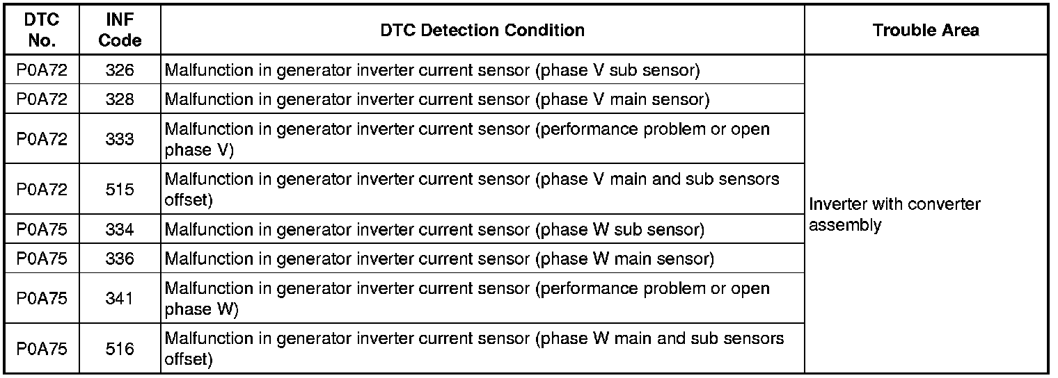 The MG ECU located in the inverter with converter assembly monitors the generator inverter current sensors. P0A72 and P0A75 indicate malfunctions in the current sensors, and they do not indicate malfunctions in the high-voltage system.